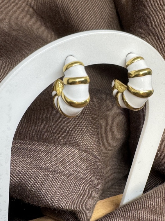 Pompowane kolczyki z emalią w kształcie rogalika.