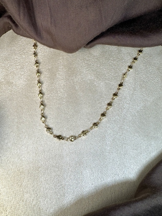 Naszyjnik wykonany z drobnych, złotych serduszek.
