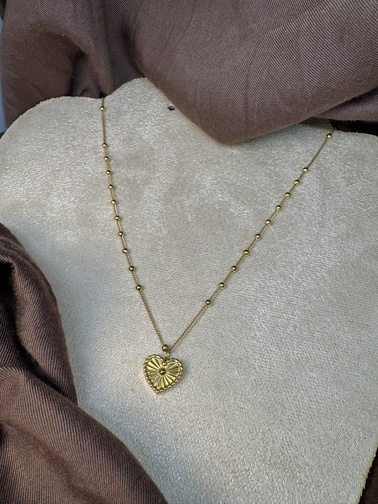 Naszyjnik CORVIA wykonany z łańcuszka ozdobionego drobnymi kuleczkami, zakończony wyjątkową zawieszką w kształcie serca.