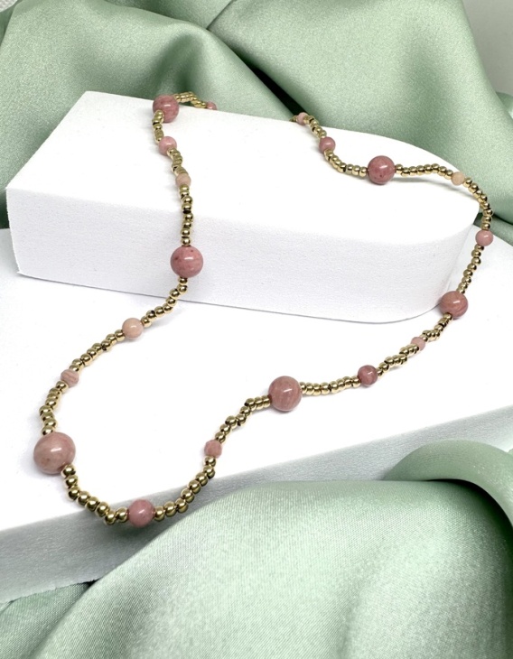 ROSE to naszyjnik z koralików w kolorze złotym i koralików w kolorze różanym w różnych rozmiarach.