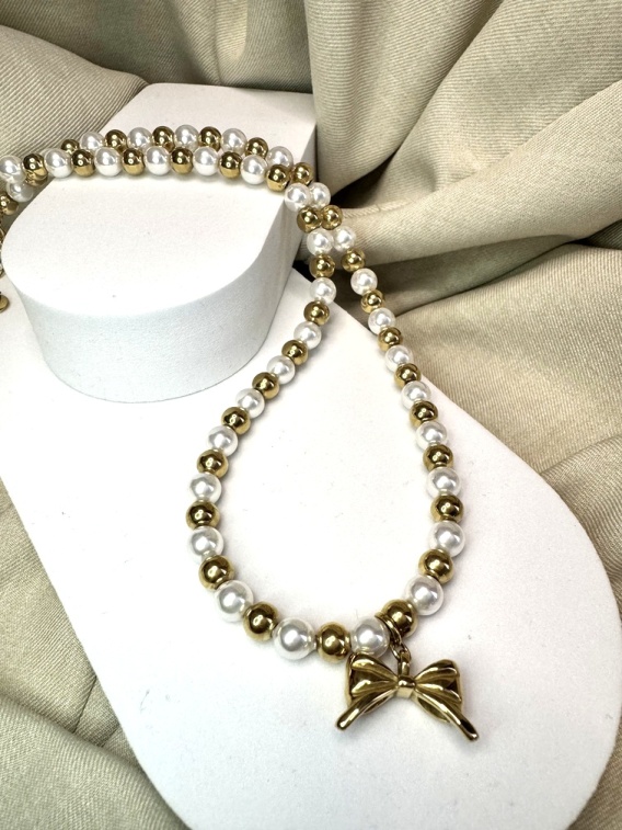 Naszyjnik VICTORIA to masywny naszyjnik z koralików w złotym kolorze i perełek, z zawieszką w kształcie kokardki.